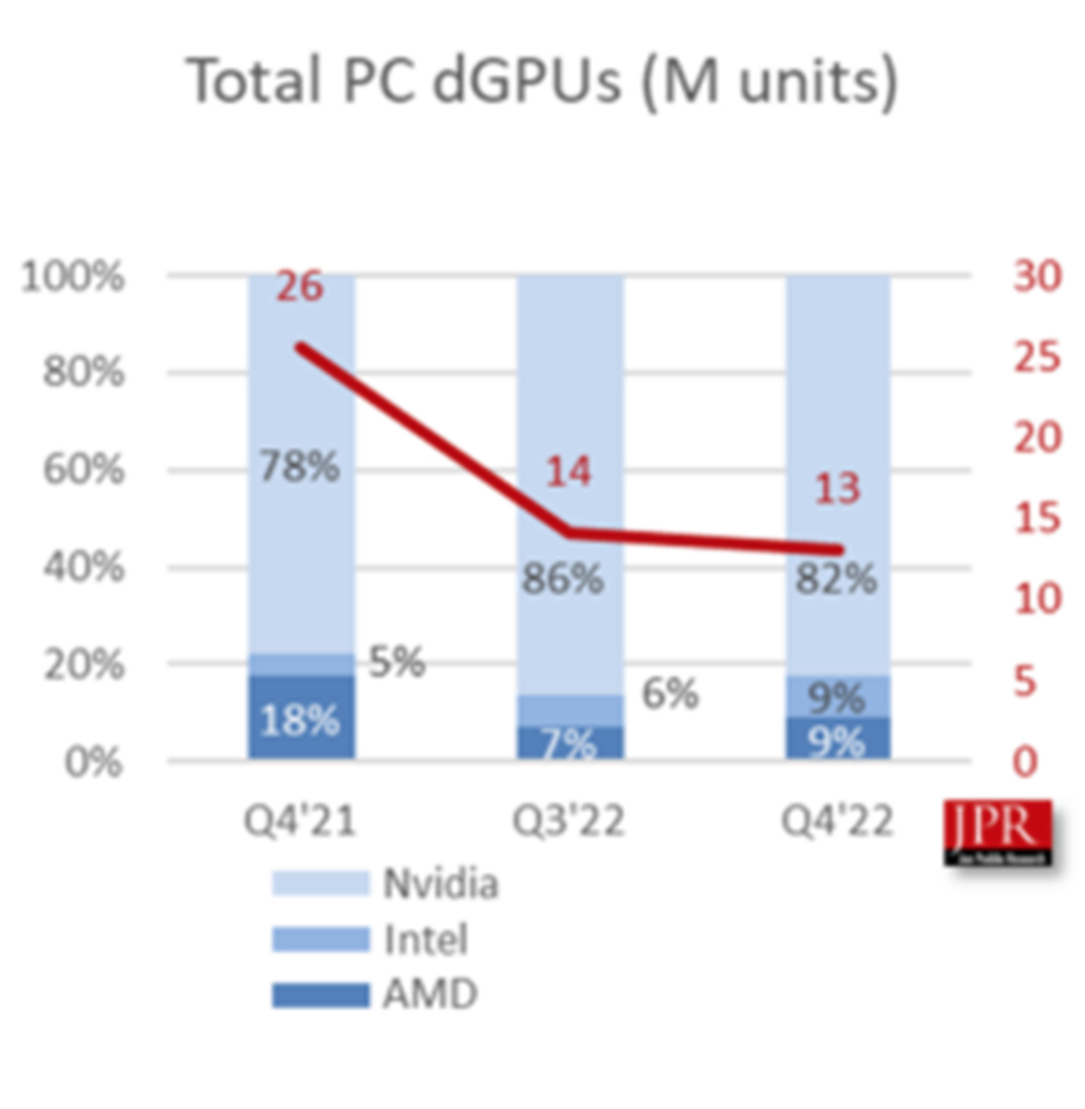 根据JPR公布的最新数据显示,在2022年全球GPU(显卡)市场同比下跌50%,销售额更是下滑了24%,整体来看目前的显卡市场可以说是“一片狼藉”。