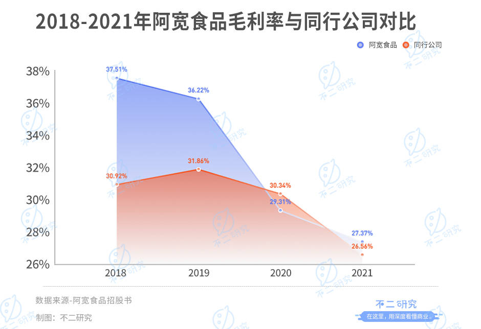 毛利率增长的转折点则来得更早。招股书显示,2018-2021年,阿宽食品的主营业务毛利率分别为37.51%、36.22%、29.31%和27.37%。从2020年开始,阿宽食品的毛利率逐年下降,并丧失市场优势,低于行业平均值。