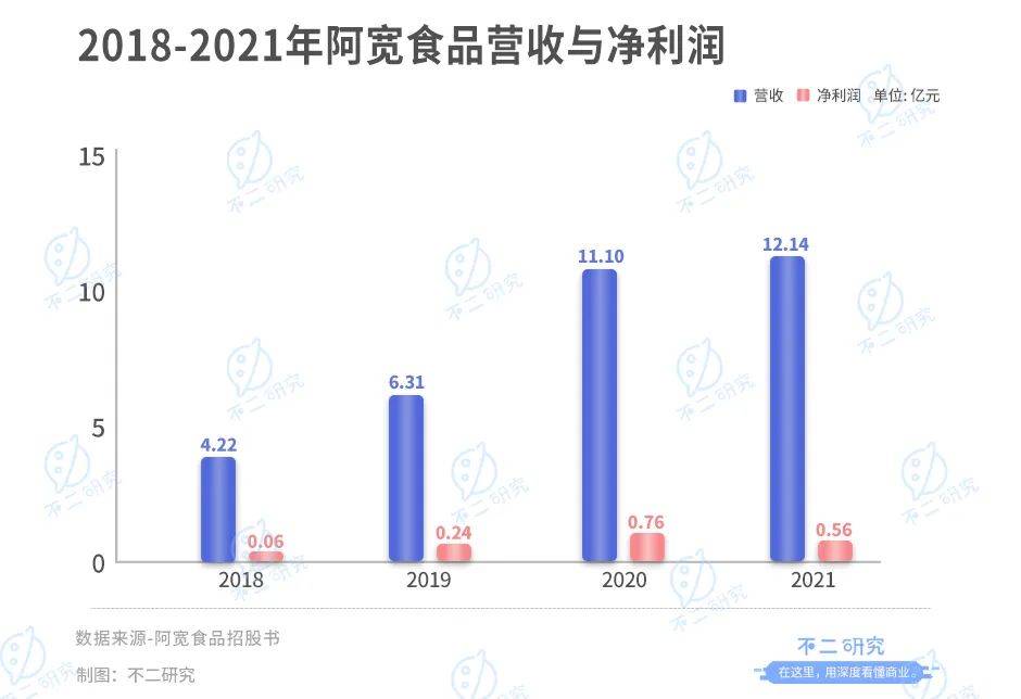 在新版招股书发现,阿宽增加了2021年全年的业绩数据,但「不二研究」发现其依然没有逃脱“增收不增利”的网红食品困局:2021年,阿宽营收为12.14亿元,同比增加9.40%;同期的净利润为5584.19万元,同比减少26.60%。