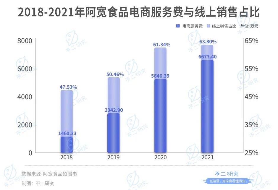 作为新消费品牌,阿宽食品的崛起与电商渠道密不可分。招股书显示,2018~2021年,线上销售渠道分别为其贡献了47.53%、50.46%、61.34%和63.30%的营收;淘宝、京东、拼多多等第三方电商平台是其最主要的销售平台。