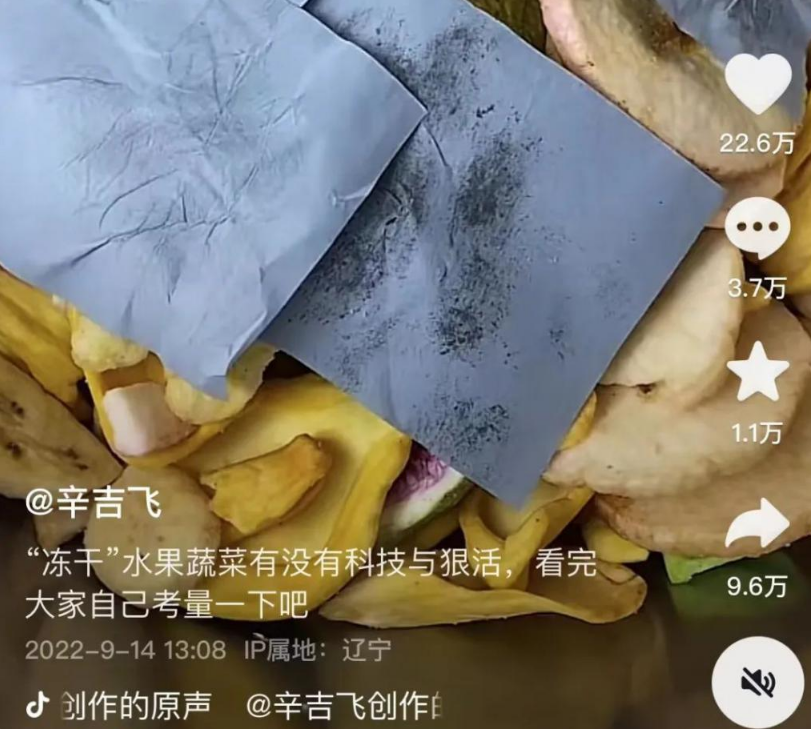 再比如,辛吉飞在名为《“冻干”水果蔬菜有没有科技与狠活,看完大家自己考量一下吧》的短视频中提到,使用吸油纸擦拭“冻干”果蔬片,结果几乎每一片都有明显的油痕,结论是水果冻干含油量大,吃了会拉肚子。