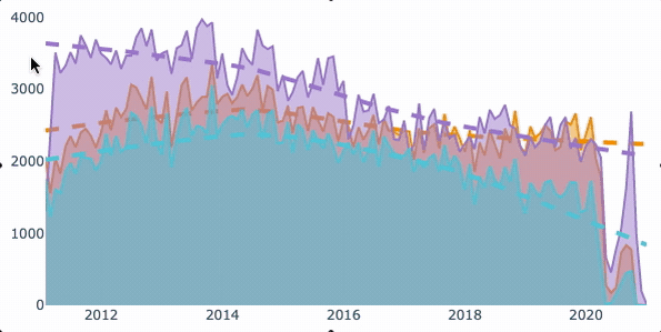 结果是一个交互式图表,显示了每一类数据随时间变化的计数和趋势线。