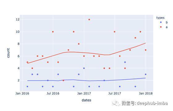 注意,我们使用Graph Objects将两类数据绘制到一个图中,但使用Plotly Express为每个类别的趋势生成数据点。