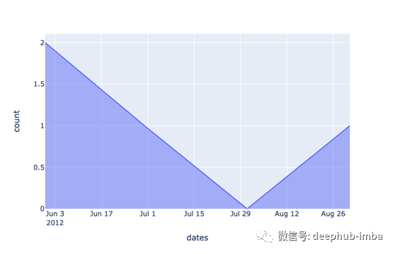 在上面的代码块中,当使用每月“M”频率的Grouper方法时,请注意结果dataframe是如何为给定的数据范围生成每月行的。最后,作为DataFrame准备的最后一步,通过“计数”将数据分组——我们在处理Plotly之后会回到这个问题上。