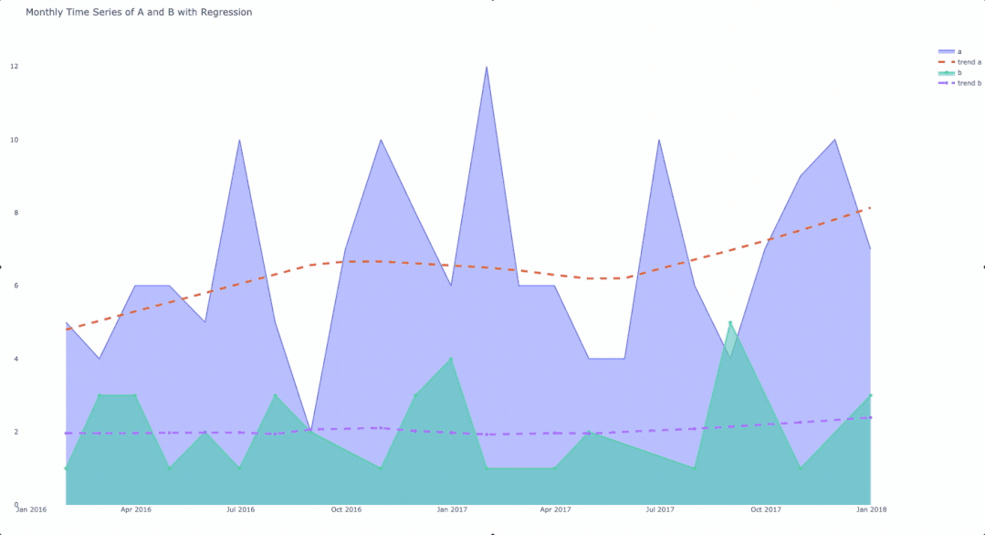 这些都很好,但是我们如何才能将回归曲线覆盖在时间序列之上呢?有几种方法可以完成这项工作,但是经过一番研究之后,我决定使用图形对象来绘制图表并Plotly表达来生成回归数据。