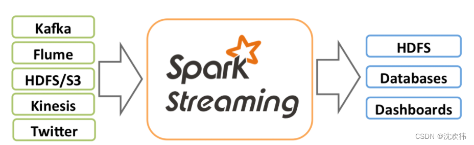 Spark Streaming 是一个对实时数据流进行高吞吐、高容错的流式处理系统,可以对多种数据源(如Kafka、Flume、Twitter 和ZeroMQ 等)进行类似Map、Reduce 和Join 等复杂操作,并将结果保存到外部文件系统、数据库或应用到实时仪表盘,如下图: