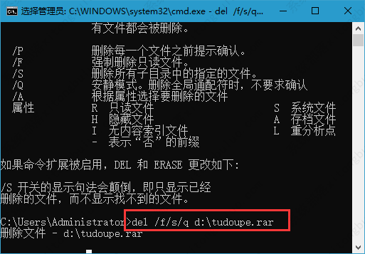 4、如果要使用强制删除命令应该输入“del /F /S /Q D:\tudoupe.rar”;