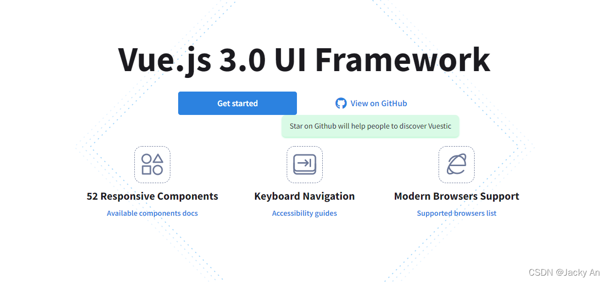 官网地址:Vuestic UI — Vue.js 3.0 UI Frameworkhttps://vuestic.dev/项目地址(Github):GitHub - epicmaxco/vuestic-ui: Free and Open Source UI Library for Vue 3 🤘Free and Open Source UI Library for Vue 3 🤘. Contribute to epicmaxco/vuestic-ui development by creating an account on GitHub.https://github.com/epicmaxco/vuestic-ui