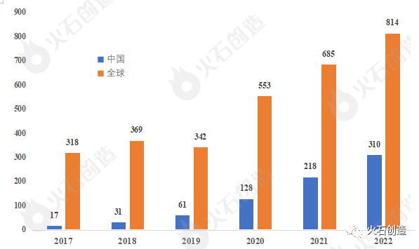 图4:2017-2022年全球和中国加氢站数量(座) 来源:火石创造根据公开资料整理