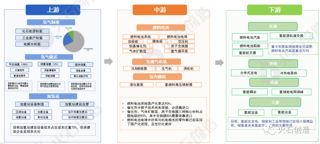 氢能作为二次能源,必须从一次能源转换得到,再运输至用能终端,转化为电力、热能或机械动力。因此,氢能主产业链可概括为“氢能制取、氢能储运、氢能加注、氢能源能量转化、氢能使用”等环节。其中,上游制氢、中游储运氢和加氢、下游多元化应用场景,主要分布于交通、工业、发电以及建筑领域。氢能源主要应用在工业领域和交通领域中,建筑、发电等领域仍然处于探索阶段。