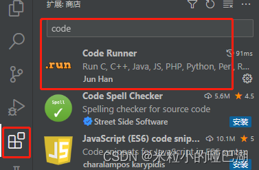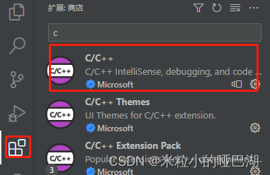 - IDE下载好后, 需要安装c/c++的扩展和run, 点击四个小方块后输入c, 选择第一个安装, 如图: