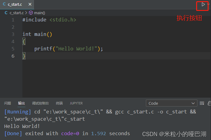 新建一个.c文件, 编写代码, 点击 右上角 执行按钮(侧三角), 编译执行