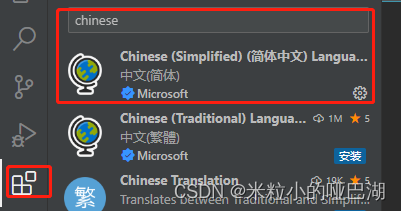 需要汉化的, 点击左侧边的四个小方块, 然后输入chinese, 选择第一个简体中文的点击安装即可