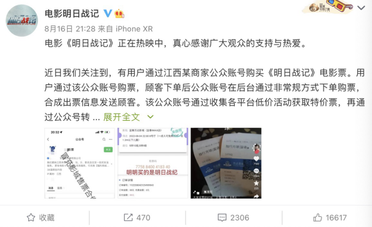 但没想到,后续竟愈演愈烈。不断有《明日战记》与古天乐的粉丝发微博称《独行月球》偷票房。8月16日,《明日战记》官微甚至还转载了网友关于偷票房的说法,并称是第三方商家行为,并非片方行为。同日,《独行月球》官微也发博澄清此事。