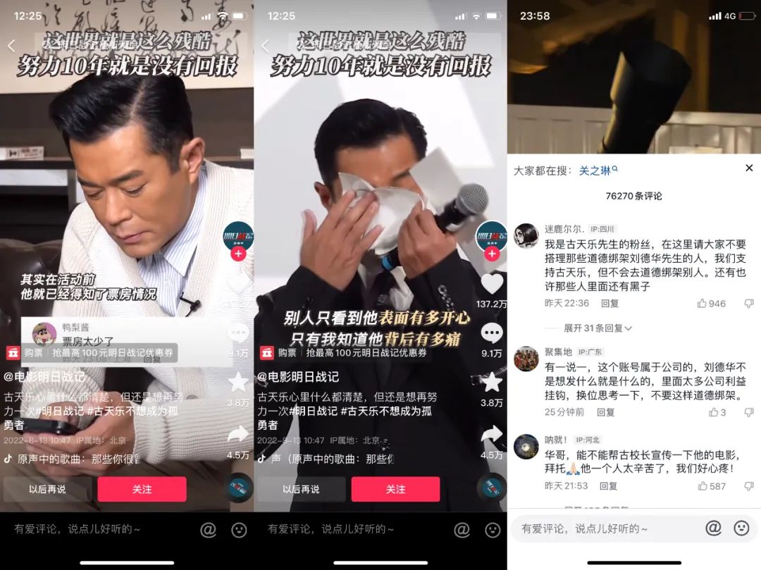 一方面,片方官抖号与古天乐在短视频上继续“卖惨”,古天乐落泪、古天乐机甲梦、古天乐手拿白纸黑字大字报短视频,相继收获百万点赞。