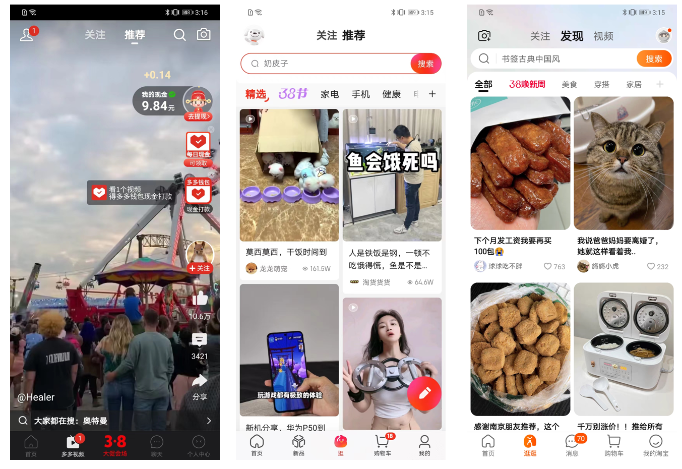 (由左至右依次为多多视频、京东逛、淘宝逛逛)