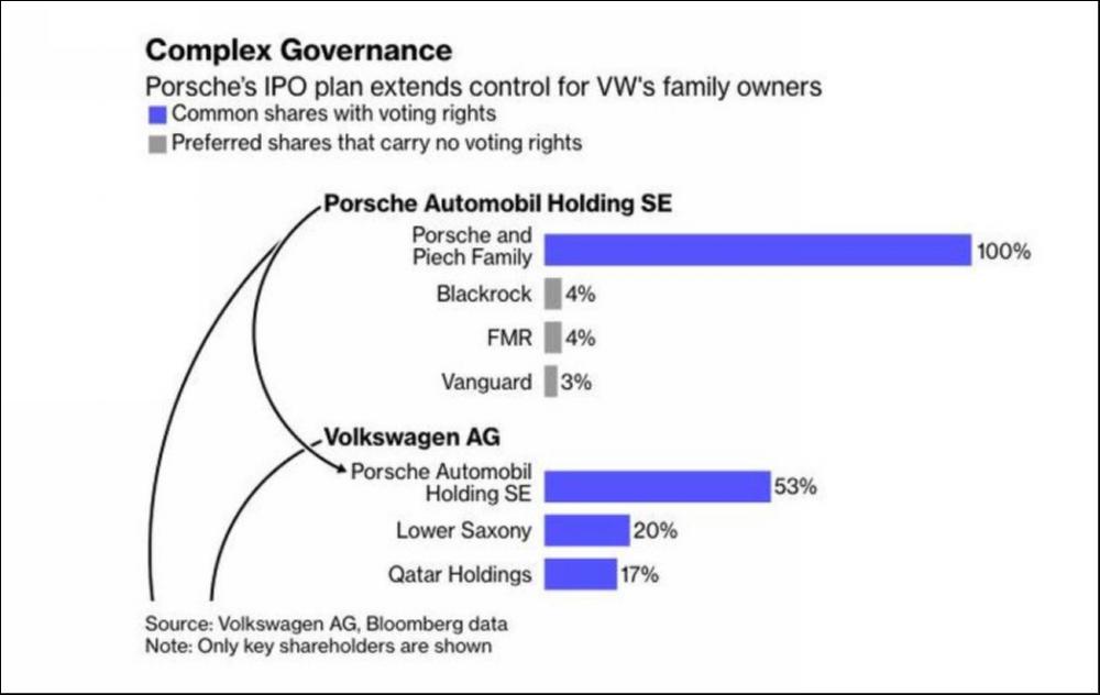 在保时捷IPO之前,由保时捷家族和皮耶希家族控制的保时捷控股拥有大众集团31.4%股权和53.3%的投票权,而大众集团则拥有保时捷汽车100%股权。