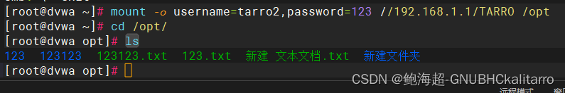 mount -o username=tarro2,password=123 //192.168.1.1/TARRO /opt将共享文件夹挂载到本地的opt下