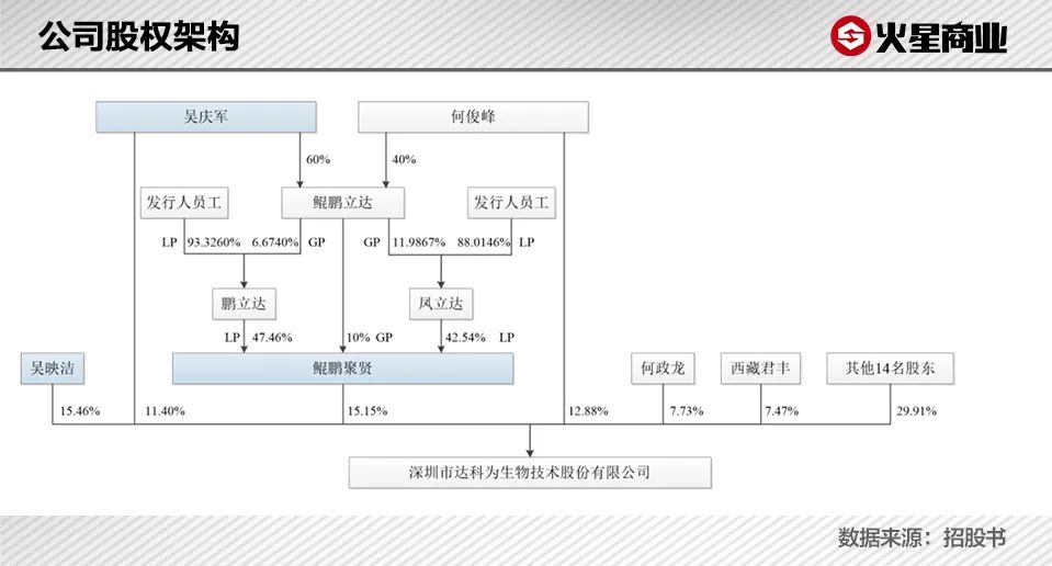 截至最新招股书,公司无控股股东,第一大股东为吴映洁,为创始人吴庆军的女儿,出生于1995年,其持有公司15.455%股份,目前正在加利福尼亚大学洛杉矶分校读经济学专业。与其父亲吴庆军合计控制达科为42.01%的股份表决权,为达科为的实控人。
