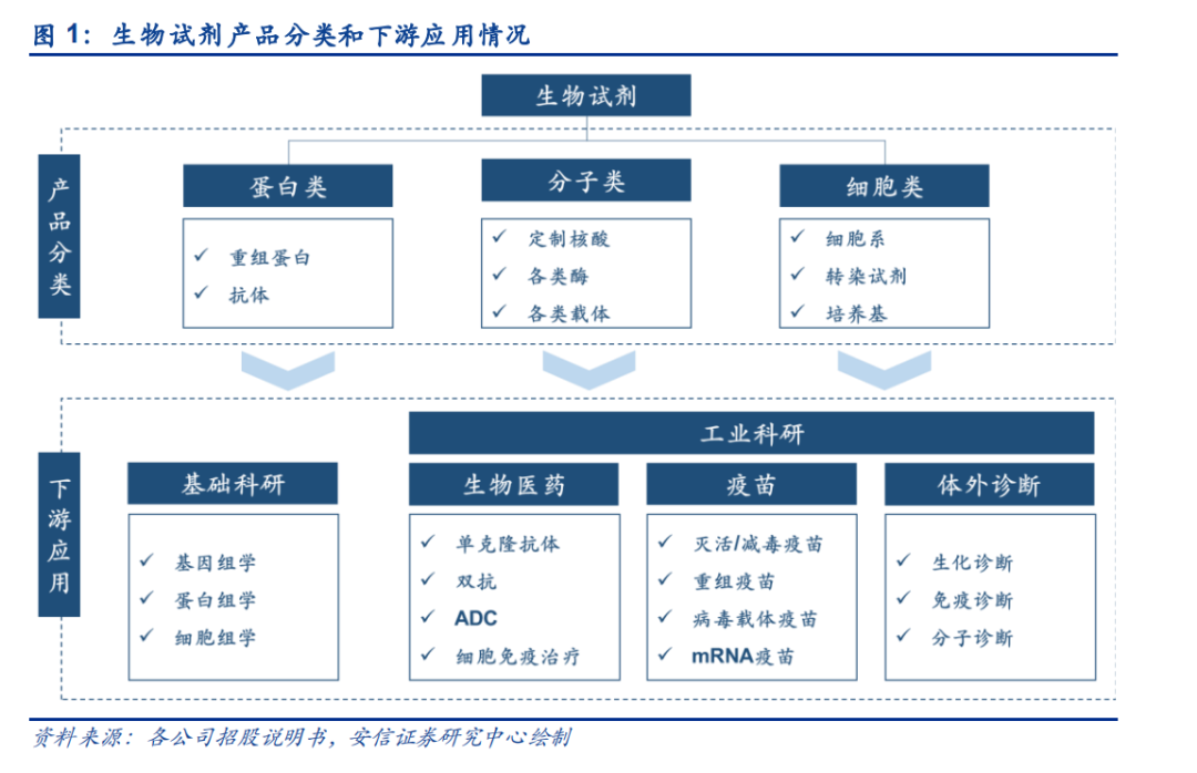 作为生命科学研究中使用的各类试剂耗材,生物试剂主要分为分子类(核酸、载体、酶等)、蛋白类(重组蛋白、抗体等)和细胞类(细胞系、转染试剂、培养基等)三大类。