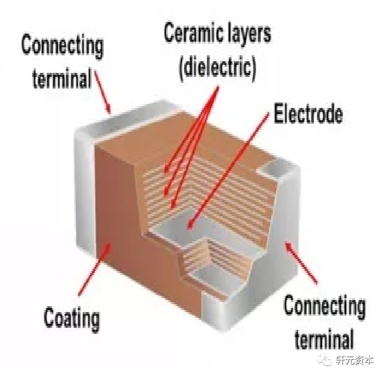 - 陶瓷电容:以陶瓷为介质材料的电容器,这类电容器分支种类繁多,包括各种封装和耐压,其中内部的介质材料也分为铁电陶瓷、钛酸钡、滑石等材料,再使用烧渗等方法做出外包裹的电极制成。陶瓷电容没有极性,带导线的陶瓷电容普遍有较高的耐压,用在有安规要求的高压场合;使用最为广泛的是片式多层陶瓷电容(Multilayer Ceramic Capacitor,MLCC),具有小尺寸、价格低、高比容、高精度的特点,能应用到高频,但材质较脆,相对容量较低。代表性公司:风华高科(000636)、三环集团(300408)等。