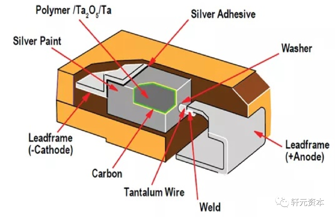 钽电容:钽电容采用固体钽为主要材料,没有电解液,使用烧结后的钽粉作为阳极,钽氧化膜做介质,锰氧化物做阴极实现。钽电容有极性,特点是等效串联电阻(ESR)小,漏电流小,容量大,相同的容量下体积比铝电解小(电解电容的电容量取决于介质的介电能力和体积,在容量一定的情况下,介电能力越高,体积就可以做的越小),钽性质稳定,温度特性更好,高频特性好;但价格较高,工作电压较低。代表性公司:振华科技(000733)、宏达电子(300726)、东方坦业(000962)等。