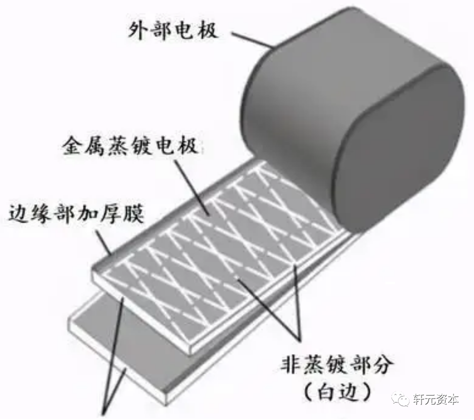 薄膜电容的工艺流程可简单总结为:在基膜上蒸镀一层金属化膜,然后将金属化膜按照一定的规格裁切、卷绕后在两端焊接引线后装入外壳。其中金属化膜的厚度、材料、图案决定着薄膜电容的电气特性和寿命,因此金属化膜是决定薄膜电容性能的决定性指标。