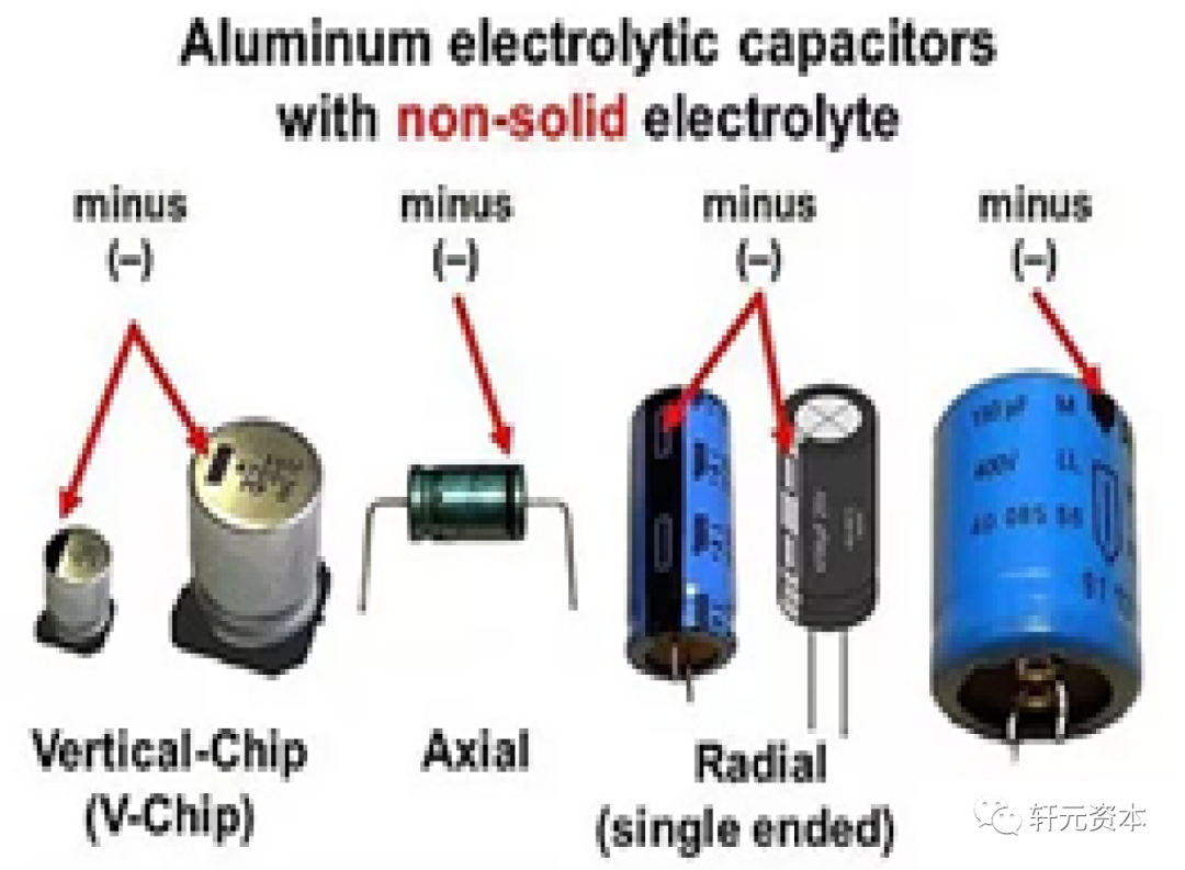 铝电解电容:该类电容使用两片铝带和两层绝缘膜相互层叠,浸泡在含酸性的合成电解液中实现。铝电解电容有极性,容易获得大容量、高耐压,且价格低廉,但高频特性不好,常用做电源输入输出滤波电路;由于内部充有电解液,铝电解电容怕高温,长期高温会使电解液挥发而失效,造成耐压下降。代表性公司:江海股份(002484)、艾华集团(603989)等。