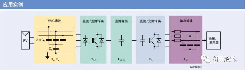薄膜电容凭借其突出的耐温耐压性能,在新能源场景下可实现直流支撑(DC-Link)、AC滤波和IGBT吸收等功能。以光伏DC-Link为例,逆变器中直流电作为输入电源通过直流母线与逆变器连接,这种方式被称为直流支撑(DC-Link);逆变器在从DC-Link得到有效值和峰值很高的脉冲电流的同时,会产生很高的脉冲电压,因此选择使用DC-Link电容器来吸收从DC-Link端接收的高脉冲电流,并且避免电压过冲和瞬时过电压的影响 。