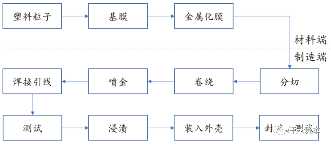 薄膜电容器的上游产业链中的主要环节为树脂—塑料基膜—金属化膜—薄膜电容器,生产难易程度为塑料基膜>金属化膜>薄膜电容器>树脂。