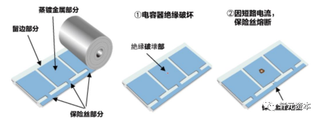 薄膜电容的蒸镀电极具有自我修复功能,当薄膜上绝缘弱的地方被施加过高电压导致击穿时,邻近处的金属镀层蒸发,在10微秒内使击穿点与周围极板隔开,电容器电气性能即可恢复正常。还有些高端电容器带“保险丝”功能,并非在基膜整个平面上形成蒸镀膜,而是分割成多个领域并用狭窄的熔断器相连接(如下图所示),当发生超过自我修复功能极限的绝缘击穿时,熔断器会熔断从而避免绝缘击穿。