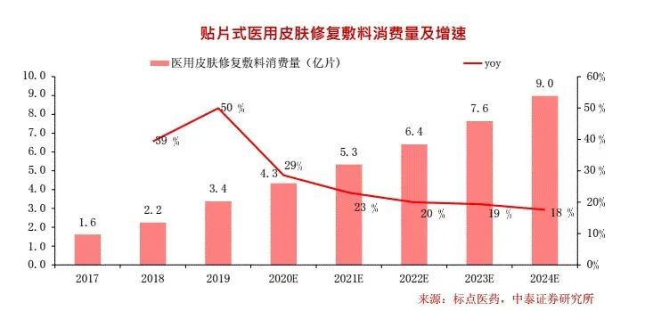 根据我国医用皮肤修复敷料批文情况,目前二类及以上批文只有48个,远低于一类医用冷敷贴的365个。