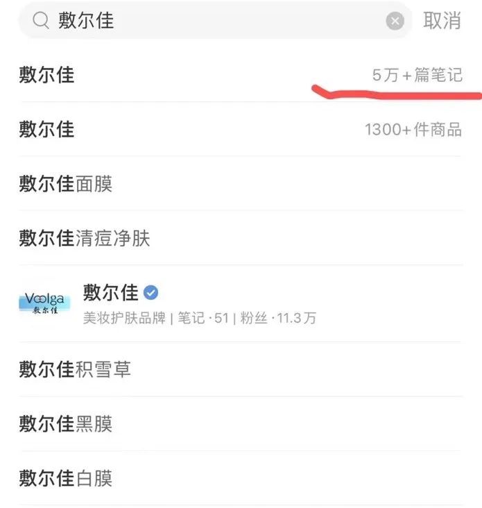 现在在小红书上输入敷尔佳,能看到笔记已经来到了5万+篇。