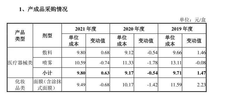 而这也正是舆论讨伐最严重的成本问题所在,据敷尔佳在招股书中提到,在2020到2021年间,其医用敷料和面膜采购单价分别为9.12元/盒和10.17元/盒,以及9.8元/盒和9.49元/盒。