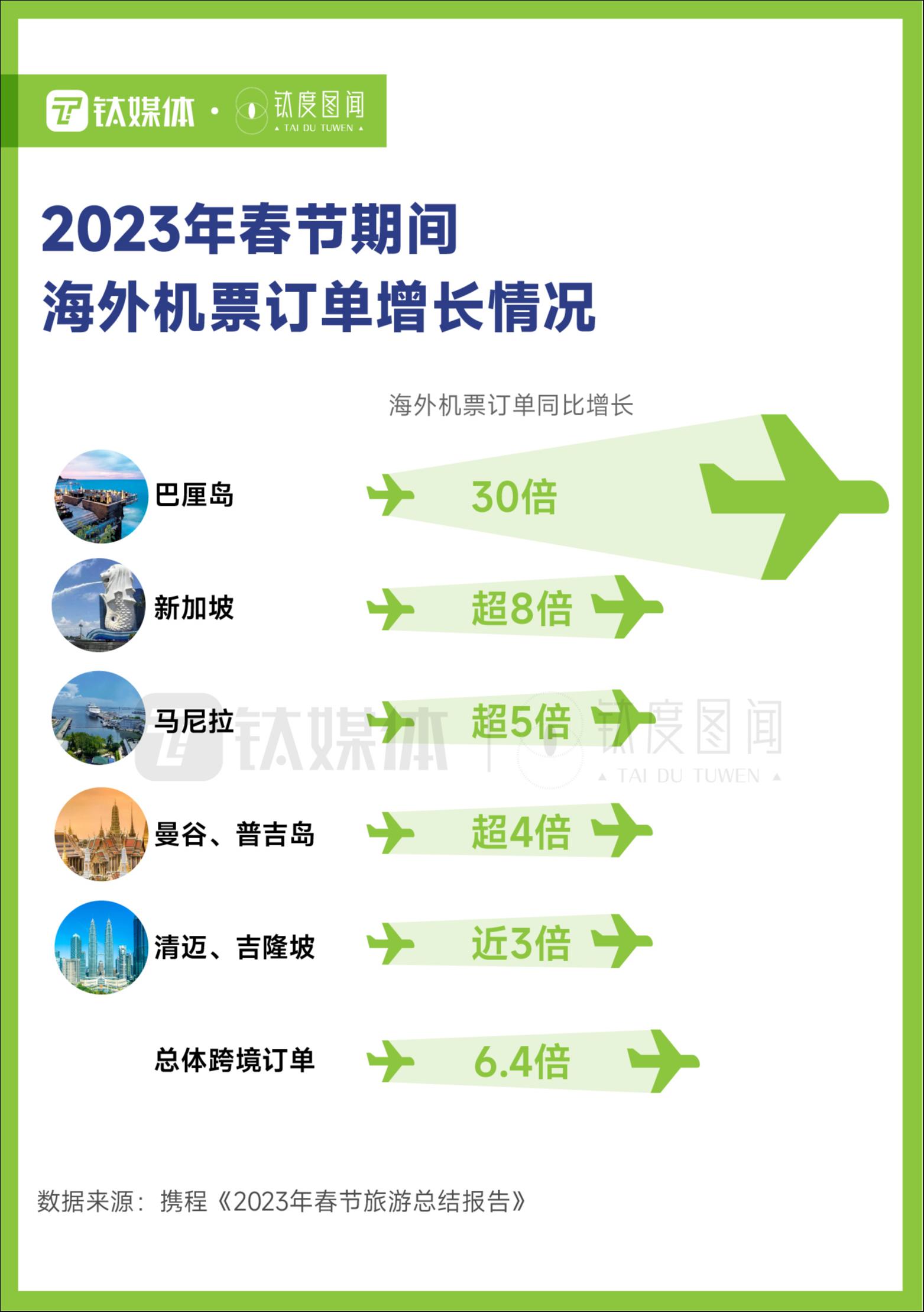 不仅国内旅游市场逐渐复苏,出境游也在逐渐回暖。随着多项优化出入境防疫措施落地,出境游迎来一波小热潮。据同程旅行数据,2023年春节期间,出入境机票订单量大幅上涨,其中出境机票预订量同比上涨258%。