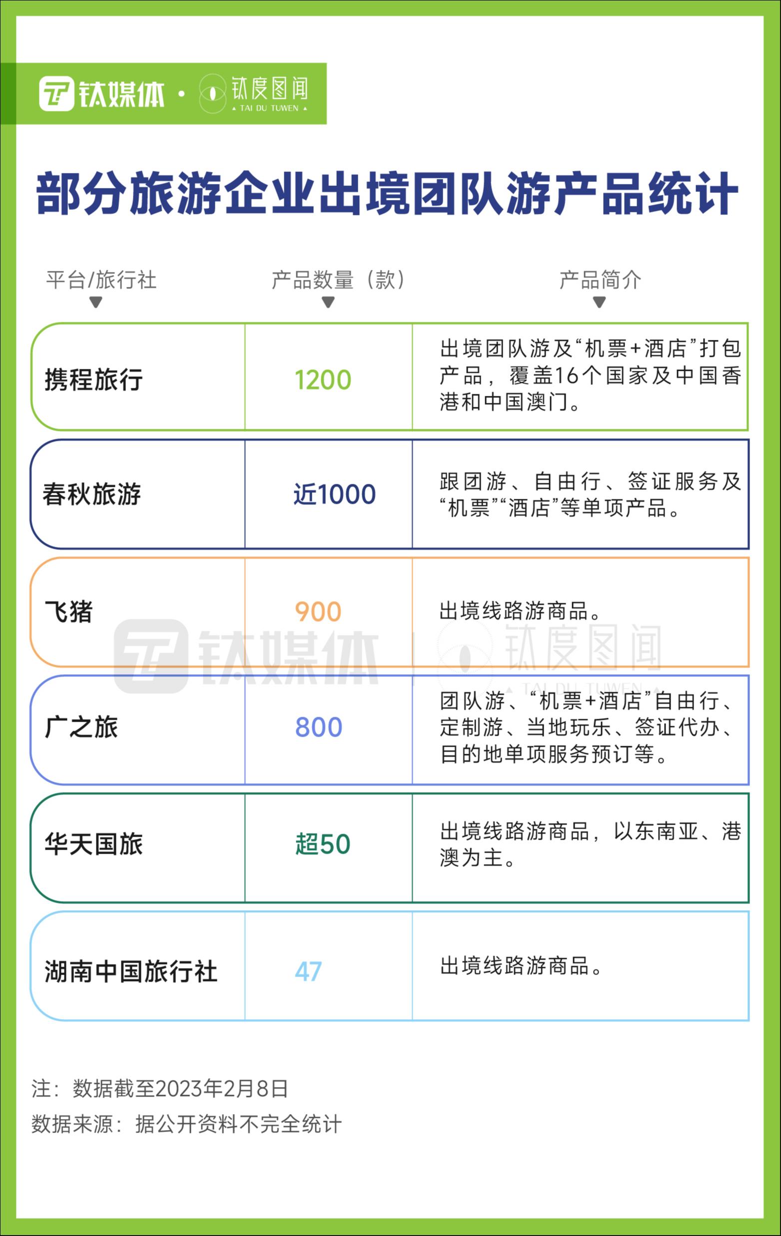 据钛媒体·钛度图闻不完全统计,携程共上线近1200条出境团队及“机票+酒店”打包产品,覆盖泰国、新加坡、印尼等16个国家及地区;春秋旅游上线销售出境游产品近千款,包括跟团游、自由行、签证服务及“机票”“酒店”等单项产品;飞猪平台已上线900余条出境线路游商品,超1万件当地玩乐商品;广之旅上架的出境游产品数量已经超过800款,产品品类包括团队游、“机票+酒店”自由行、定制游、当地玩乐、签证代办、目的地单项服务预订等;华天国旅已上线50多条出境游线路产品,以东南亚、港澳为主;湖南省中国旅行社已推出47条出境游线路,2月11日首个旅游团出发至香港。