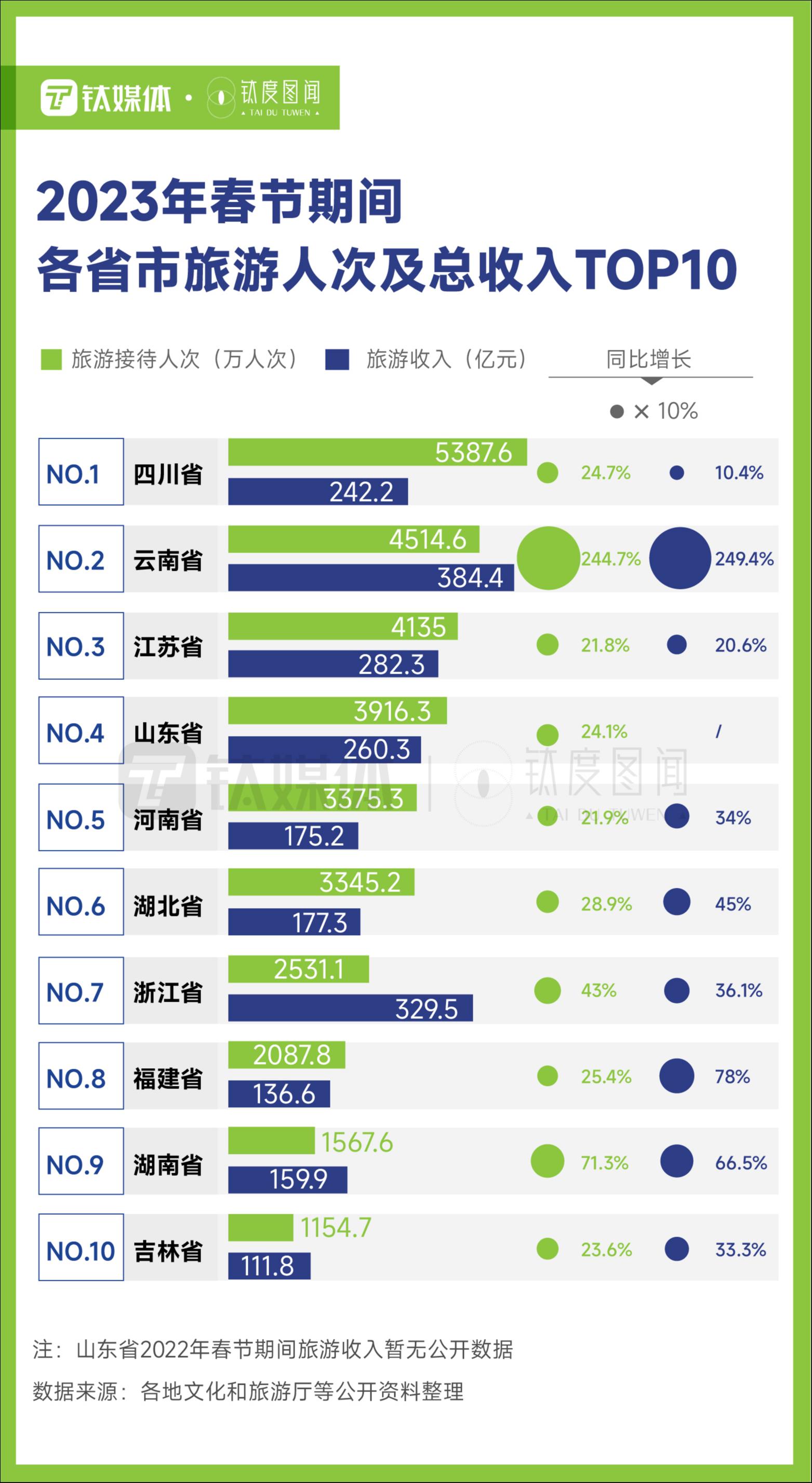 据钛媒体·钛度图闻统计的各省市公布的旅游数据,在春节7天假期间,四川省接待游客人次最多,达到5387.59万人次,同比增长24.7%,恢复到2019年春节的89.73%;实现旅游收入242.2亿元,同比增长10.4%,恢复到2019年春节的84.75%。此外,云南、江苏春节假期游客接待量也超过4000万人次;山东、河南、湖北游客接待量超过3000万人次,浙江、福建、湖南、吉林游客接待量均超千万。