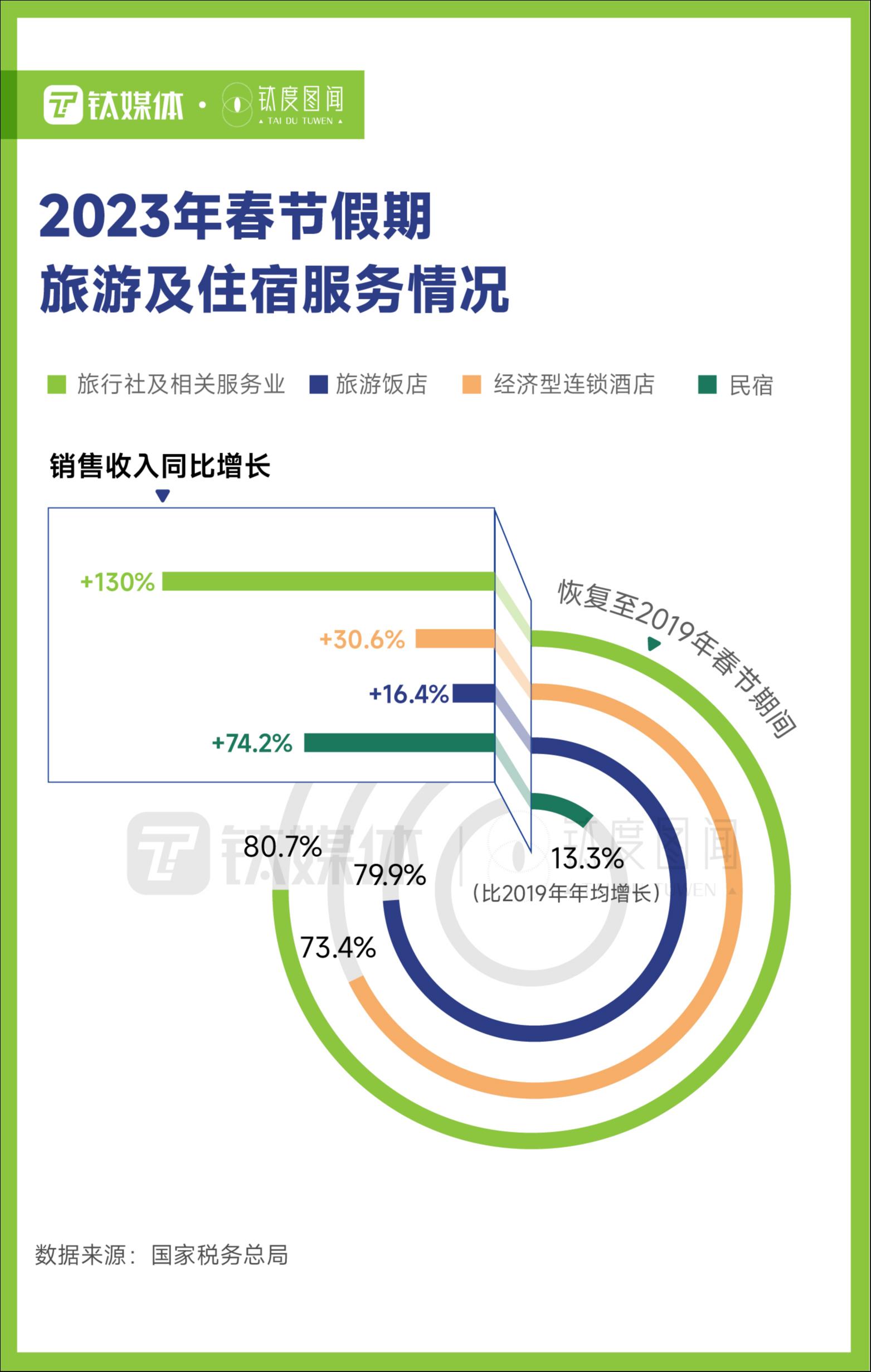 旅游作为综合性产业,不光带火了旅游消费,也让更多相关产业随之受益。国家税务总局增值税发票数据显示,春节假期,旅行社及相关服务业销售收入同比增长1.3倍,已恢复至2019年春节假期的80.7%。旅游饭店、经济型连锁酒店销售收入同比分别增长16.4%、30.6%,分别恢复至2019年春节假期的73.4%、79.9%。民宿行业提供个性化服务受到游客欢迎,销售收入同比增长74.2%,比2019年春节假期年均增长13.3%。