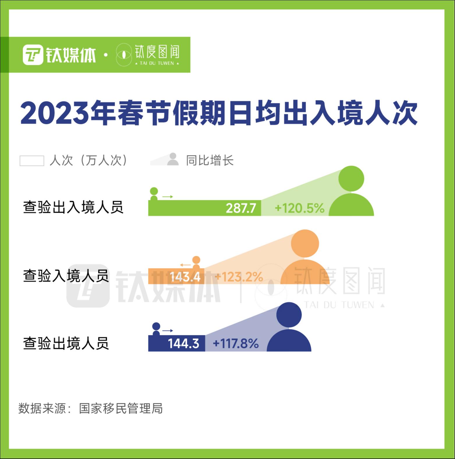 2023年春节假期,出境入境人数双向增长。全国移民管理机构共检查出入境人员287.7万人次,其中入境143.4万人次,较去年春节假期上升123.2%;出境144.3万人次,较去年春节假期上升117.8%。