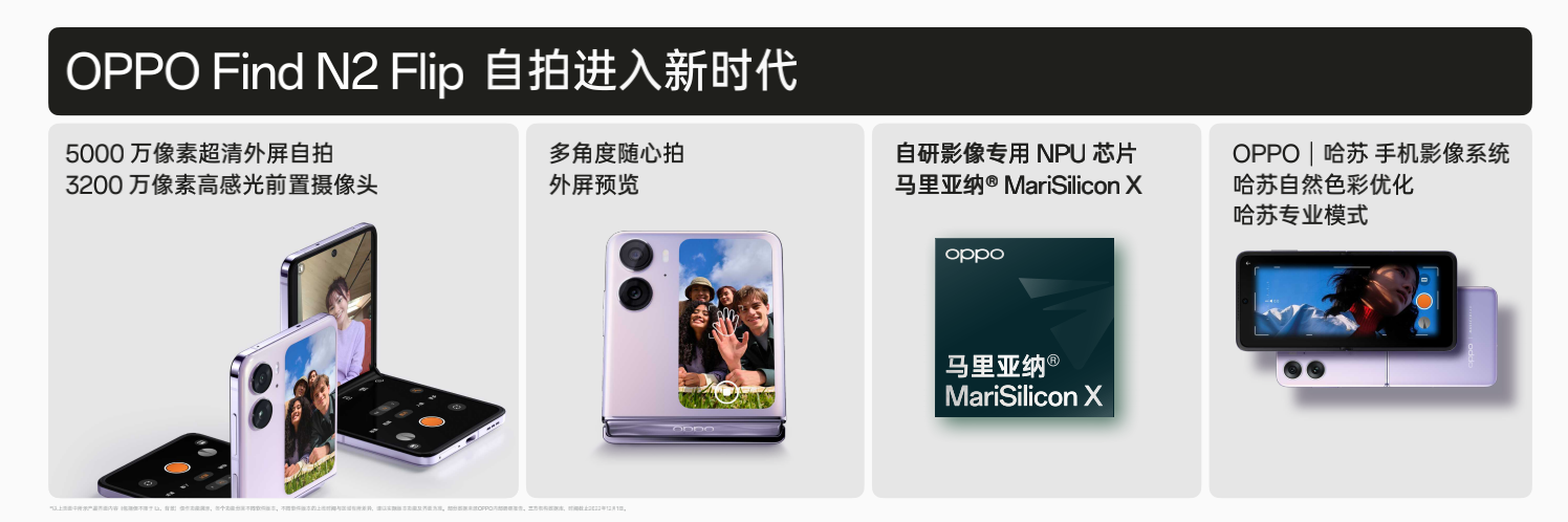 影像配置方面,Find N2 Flip主摄搭载5000万像素IMX890超感光大底传感器。前置搭载与索尼联合定制的IMX709传感器,配合OPPO自研美颜算法,呈现更加自然、清晰的自拍表现。在马里亚纳 MariSilicon X的加持下,呈现更加专业的画质表现。同时,借助多角度自由悬停功能,Find N2 Flip提供延时摄影、腰平取景、低角度拍摄等多种丰富玩法。此外,得益于17:9的外屏比例,Find N2 Flip可在任意窗实现几乎不裁切的预览效果。