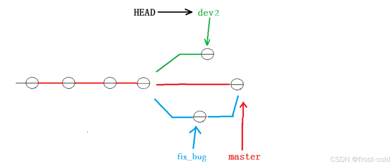 但是此时有个问题是,修改了 bug 之后的代码并没有在 dev2 分支上,