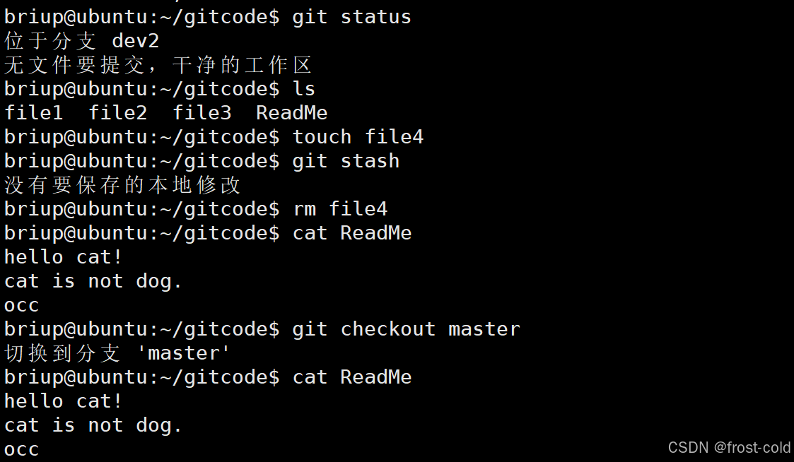 如果在 dev2 分支进行开发修改了工作区不想影响 master 的工作区的话,可以使用以下命令,将工作区的修改写入 stash 中