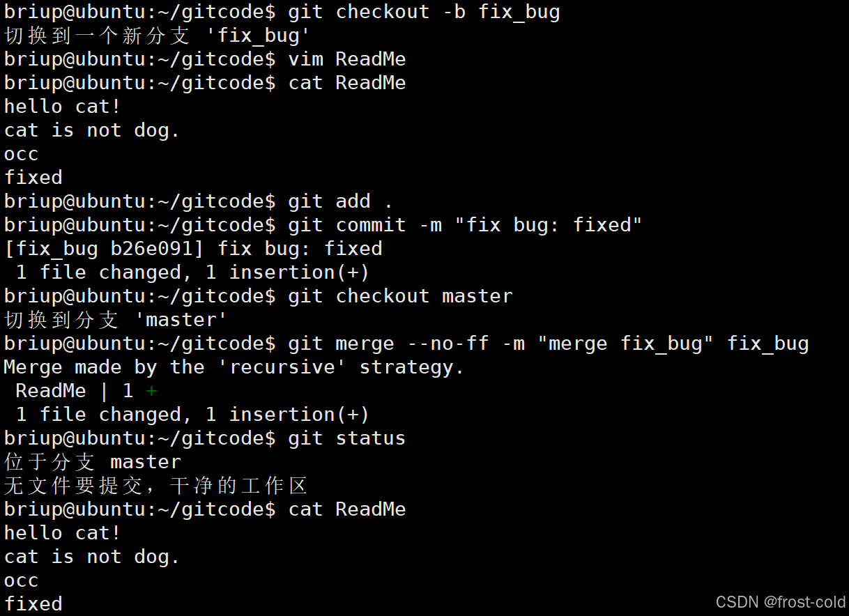 创建一个分支 fix_bug 进行修改 bug,进入 ReadMe 文件修改 bug,提交到仓库,然后切换到 master 分支进行合并。此时 master 分支是修改完 bug 后的分支。