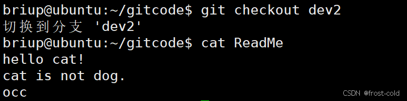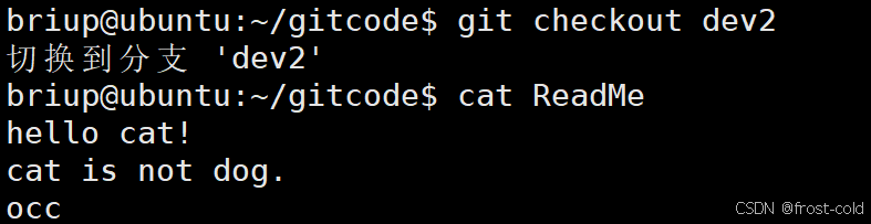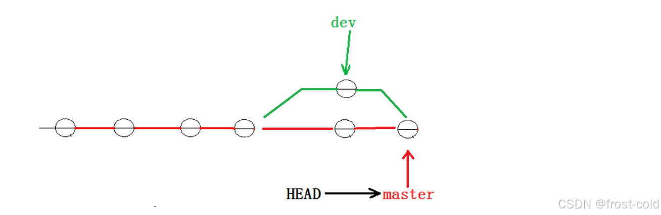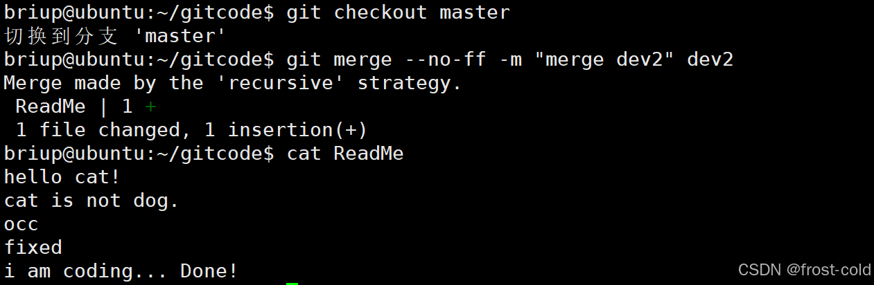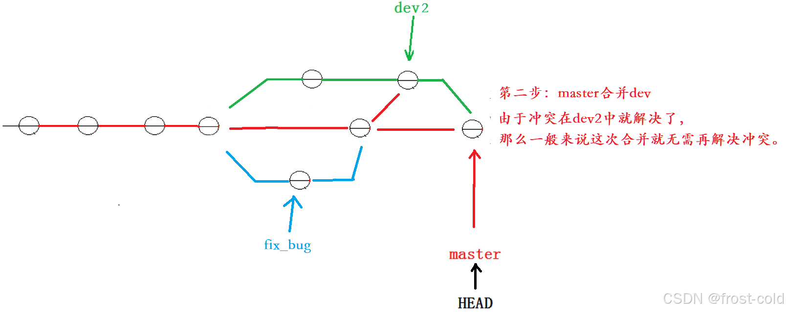 然后再切换到 master 分支上,然后将 dev2 分支合并到 master,此次没有合并冲突