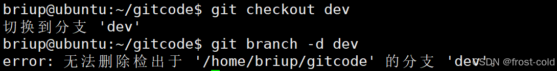 以下是一个错误删除分支示范的删除分支,如下图,已切换到 dev 分支,但是进行删除 dev 分支,这显然是不能成功的。