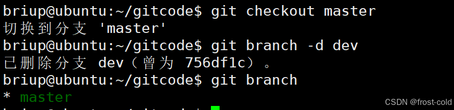 下面进行正确示范,我们切回 master 分支,然后删除 dev 分支,删除成功,只剩下 master 分支。