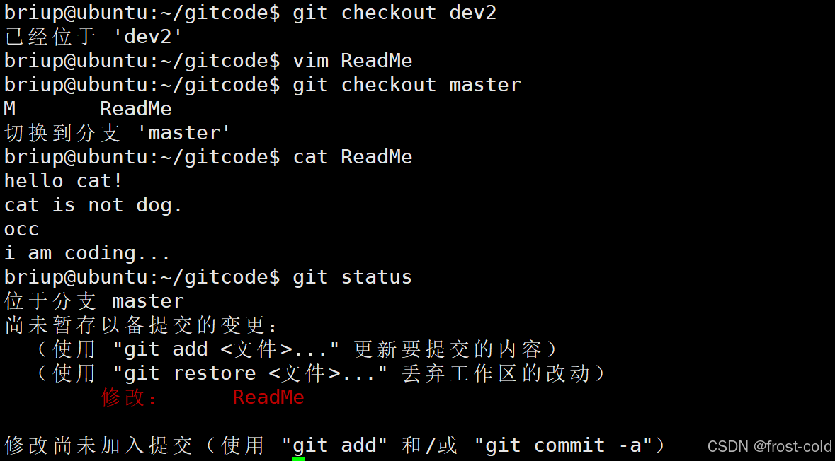 此时切换到 dev2 分支,模拟正在开发写代码,修改 ReadMe 文件,此时发现 master 分支有 bug,然后切换到 master 分支进行修改 bug,此时发现,ReadMe 文件在 master 分支里面也被修改了。(这些修改都是位于工作区的修改)
