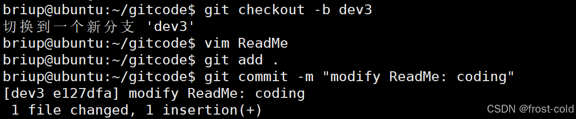 创建并切换到一个新的分支 dev3,并且在 ReadMe 里面进行开发新功能,并且提交到仓库