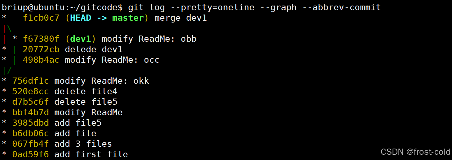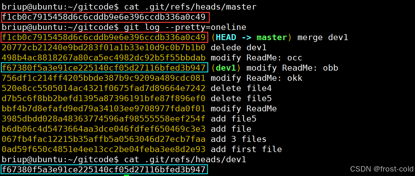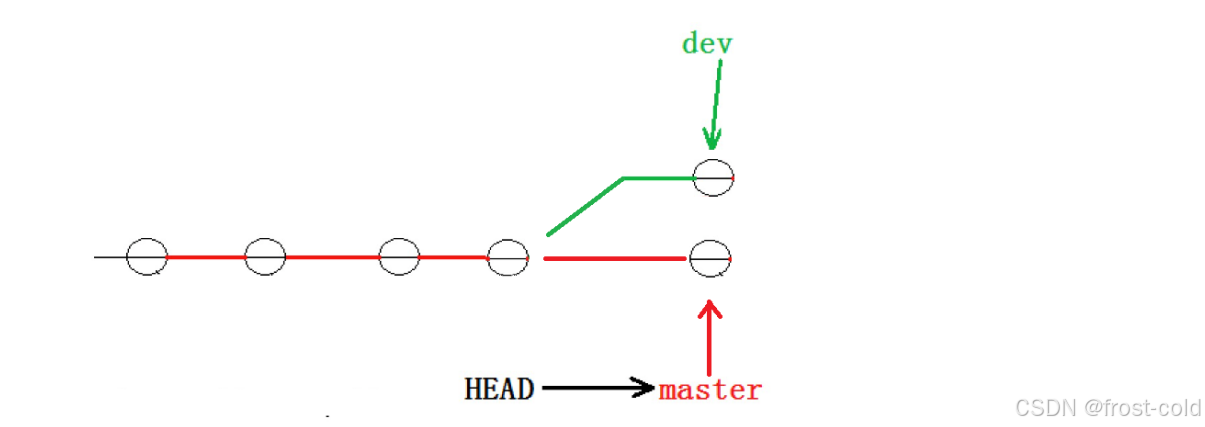 此时 master 指向的索引为最新一次的修改,而 dev1 指向的还是原来的修改: