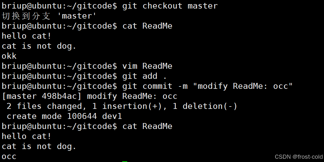 切换到分支 master,修改 ReadMe 文件为 occ,并提交到版本库